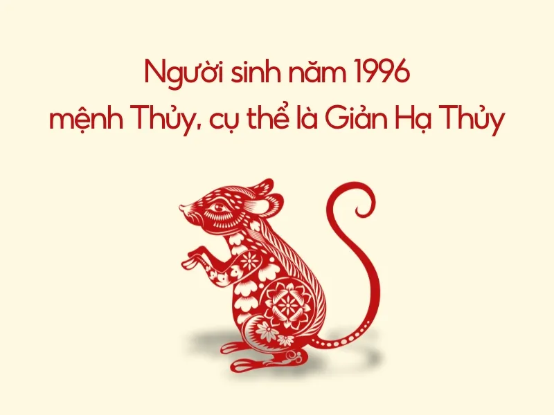 Người sinh năm 1996 thuộc mệnh GIẢN HẠ THỦY, có nghĩa là "Nước dưới khe". Theo Ngũ hành, Thủy là một trong năm yếu tố cơ bản (Kim, Mộc, Thủy, Hỏa, Thổ) cấu thành nên vạn vật trong vũ trụ. Giản Hạ Thủy không phải là nước mênh mông như biển cả hay sông hồ, mà là dòng nước chảy âm thầm dưới các khe núi, khe đá - tinh tế, kiên nhẫn và có khả năng thích ứng cao.